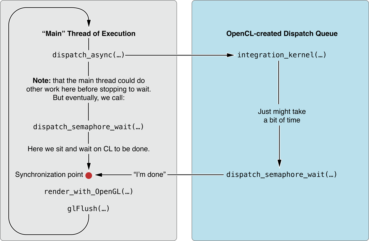 The dispatch_semaphore_t (line [1]) is created before the main loop begins. In the block submitted to the dispatch queue created in OpenCL, just after the kernel call, the semaphore is signaled. Meanwhile, the "main" thread of execution has continued along -- perhaps doing more work -- eventually arriving at the call to dispatch_semaphore_wait(...) (line [3]). The main thread stops at this point and waits until the post-kernel signal "flips" the semaphore. Once that occurs, the code can continue to the OpenGL rendering portion of the code, safe in the knowledge that the position update for this round is complete.