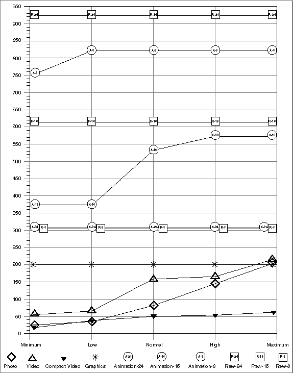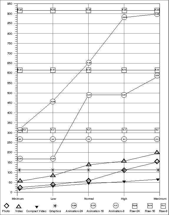 All of the graphs show the compressed data size (in kilobytes) versus the quality of an image at minimum, low, normal, high, and maximum compression settings. The Raw Compressor is included to show the size of the image in raw pixels. The Raw Compressor is not useful for storing still images, since it does not even use the simple packing technique used by QuickDraw (notice that the 24-bit raw format is larger than the uncompressed PICT file).