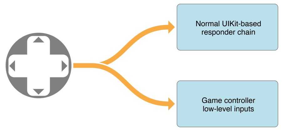 The default behavior in UIKIt on tvOS is to process all low-level controller inputs and deliver high-level events to the responder chain. Low-level game controller inputs are not available by default, because all of the events are processed by UIKit. When you want to read controller input directly, you need to turn off UIKit’s behavior. Controller input destination shows the two input paths.