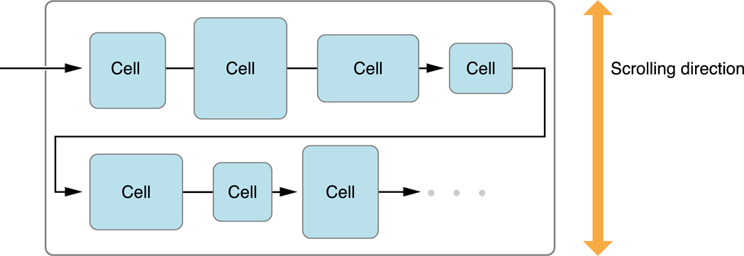 You can arrange items in your collection views using a concrete layout object, the UICollectionViewFlowLayout class. The flow layout implements a line-based breaking layout, which means that the layout object places cells on a linear path and fits as many cells along that line as it can. When the layout object runs out of room on the current line, it creates a new line and continues the layout process there. Figure 3-1 shows what this looks like for a flow layout that scrolls vertically. In this case, lines are laid out horizontally with each new line positioned below the previous line. The cells in a single section can be optionally surrounded with section header and section footer views.