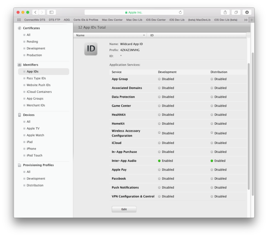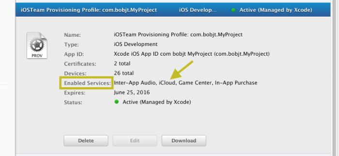When a target Capability is toggled in Xcode, the corresponding Service is enabled on your app’s App ID on the website.