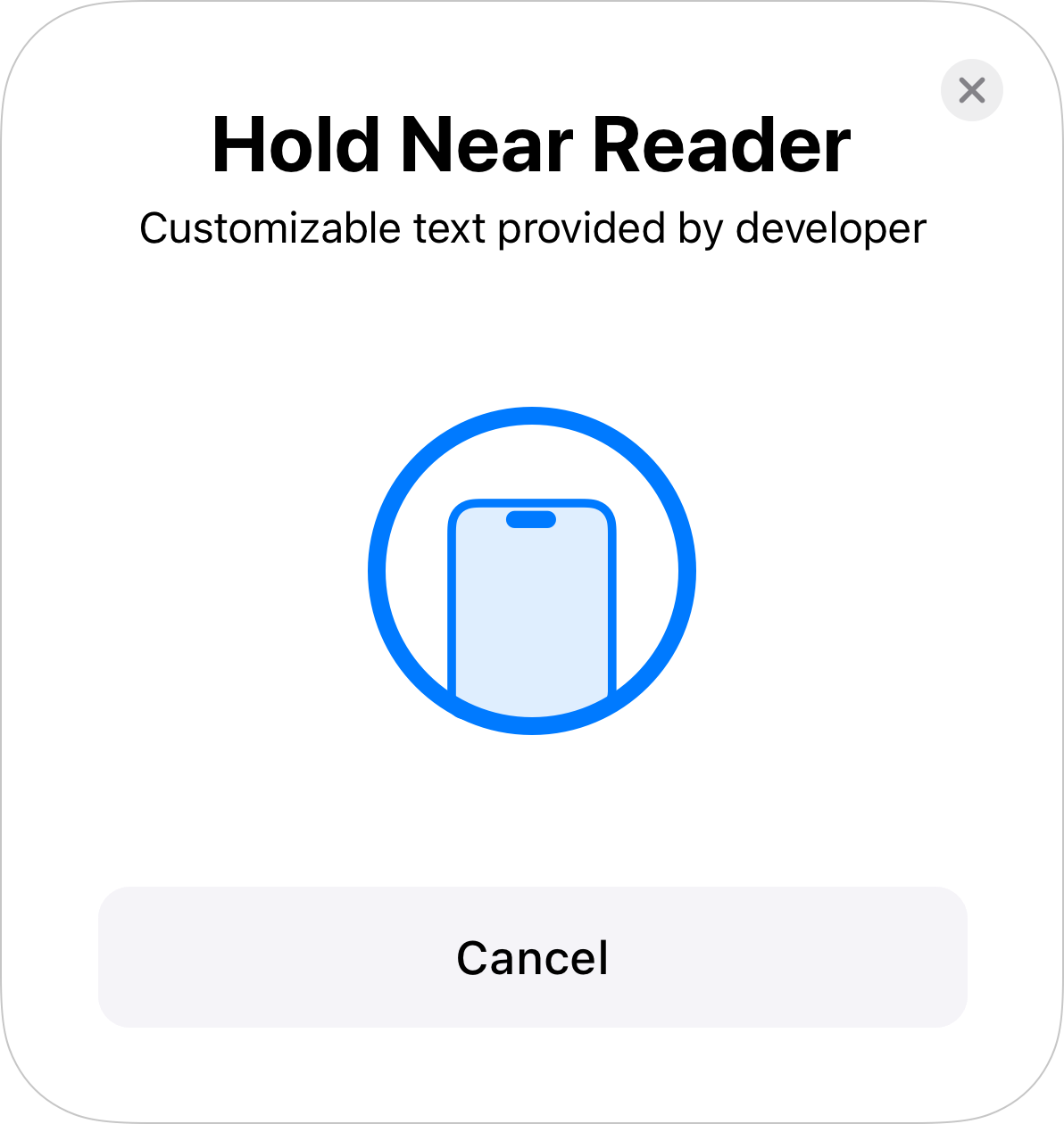 Eligible iOS apps running on supported iPhone models must use the proposed solution to present an eligible credential to a compatible near-field communication (NFC) terminal. In the iOS app, you must invoke an NFC presentment sheet with customizable text whenever users are about to make a contactless transaction.